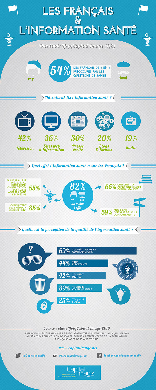 « Pour les 25 ans de Capital Image, nous avons réalisé avec l'Ifop une étude sur "Les Français et l'information santé". Les résultats, divulgués au 24ème Festival de la Communication Santé, reflètent les préoccupations croissantes des Français pour les questions de santé (54% des Français interrogés déclarent être de plus en plus préoccupés par les questions de santé). Ils rappellent que la télévision reste le média préféré des Français en matière d'information santé (42%) ; soulignent leur hyperréactivité aux infos santé (82% des Français interrogés déclarent qu’ils vont agir après avoir pris connaissance d’une info santé), mais également leur perception critique sur la qualité de l'information : 2 Français sur 3 déclarent trouver l’information santé floue et contradictoire.