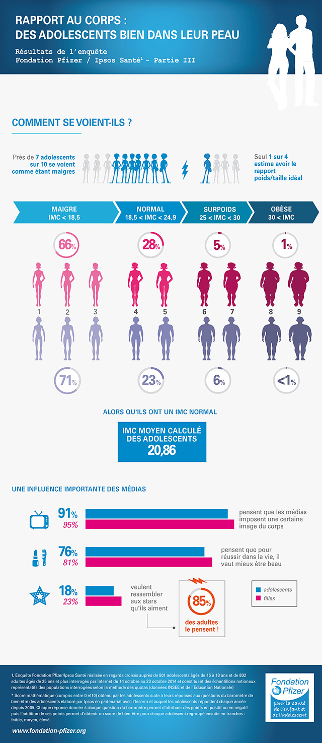 D’après l’enquête Fondation Pfizer/Ipsos Santé « Vivre son corps », les adolescents entretiennent un bon rapport avec leur corps : 9 adolescents sur 10 s’estiment bien dans leur corps sans chercher en majorité à le transformer et 77% aiment leur corps (84% des garçons et 69% des filles), 40% sont à l’aise avec leur corps, 21% en sont contents, 13% épanouis et 10% en sont même fiers.