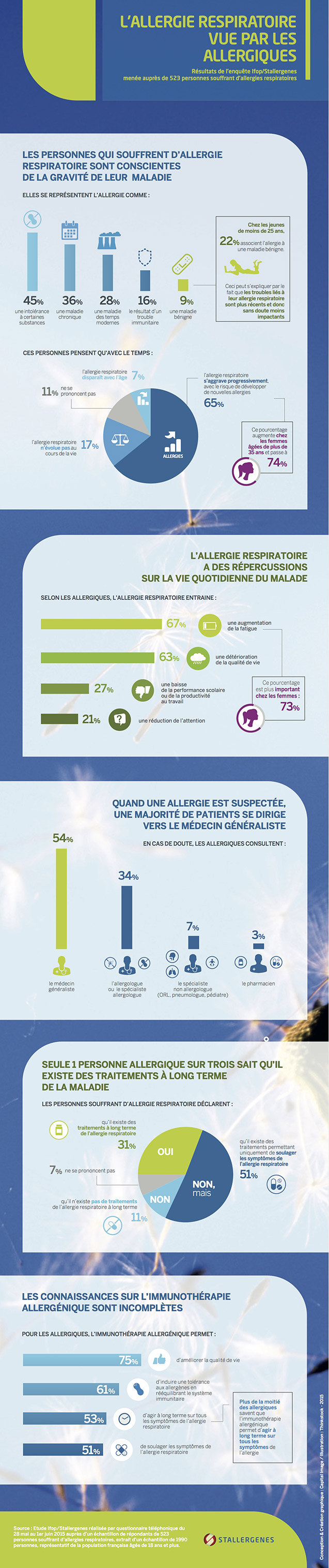 Les résultats de l’enquête Ifop/Stallergenes révèlent que 65% des personnes souffrant d’allergies respiratoires ont conscience que celles-ci peuvent s’aggraver progressivement dans le temps entrainant le risque de développer de nouvelles allergies. Forts de ce constat, ils ne sont pourtant que 34% à consulter un spécialiste allergologue pour leur prise en charge ; 54% se tournant vers leur médecin généraliste. Résultat : seulement 31% des patients savent qu’il existe des traitements contre les allergies respiratoires, tels que l’immunothérapie allergénique (ITA), qui peuvent être efficaces à long terme.